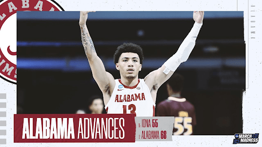 Alabama came in hot with a 68-55 win over the #15 seed, Iona. The Crimson Tide used this momentum to get to the second round, where they beat Maryland 96-77.