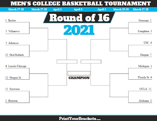 The list of teams still playing includes Gonzaga, Michigan, Loyola of Chicago, Syracuse, Florida State, Creighton, USC, Oregon, UCLA, Alabama, Baylor, Villanova, Arkansas, Oral Roberts, Houston, and Oregon State.