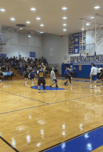 The band marched through the high school hallways, leading everyone to the gym where the faculty/student basketball game began. The faculty prevailed and is making sure that the students never live it down.