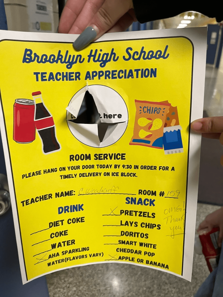 Today, all teachers have signs hung up on their doors, and they will choose the snacks and beverages they want to be delivered to them throughout the day. It is a small token of our appreciation for everything they do to help the students here at BHS.